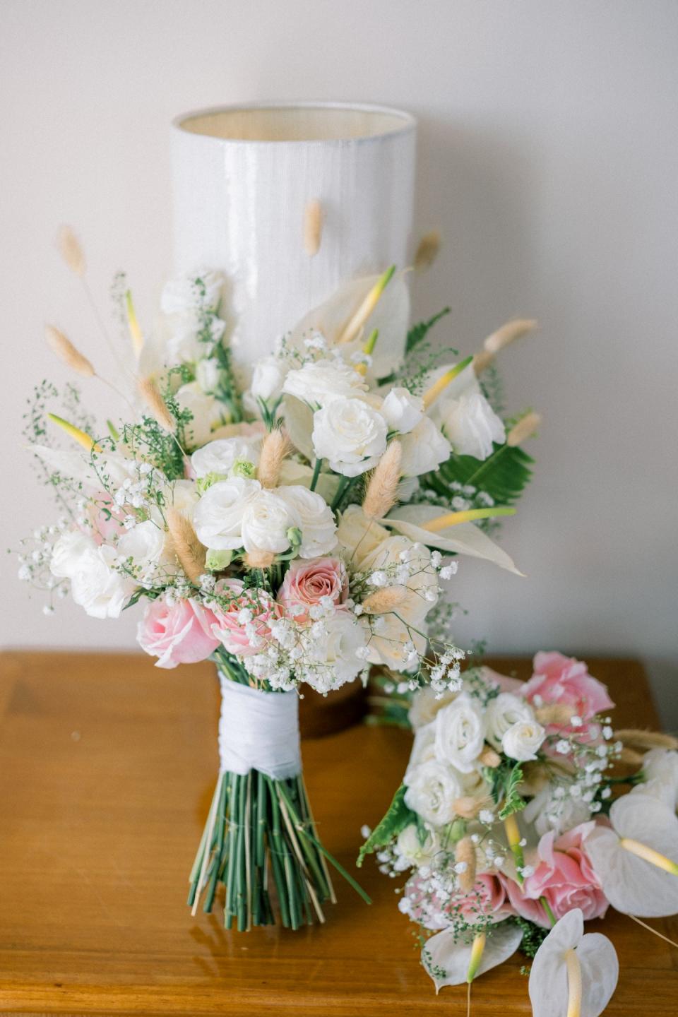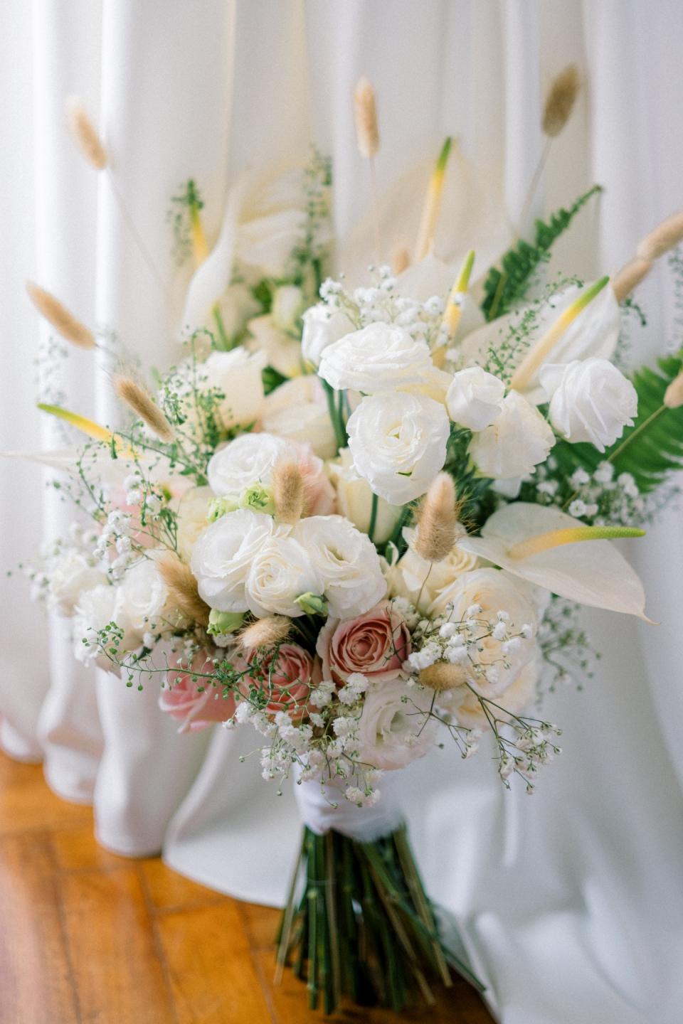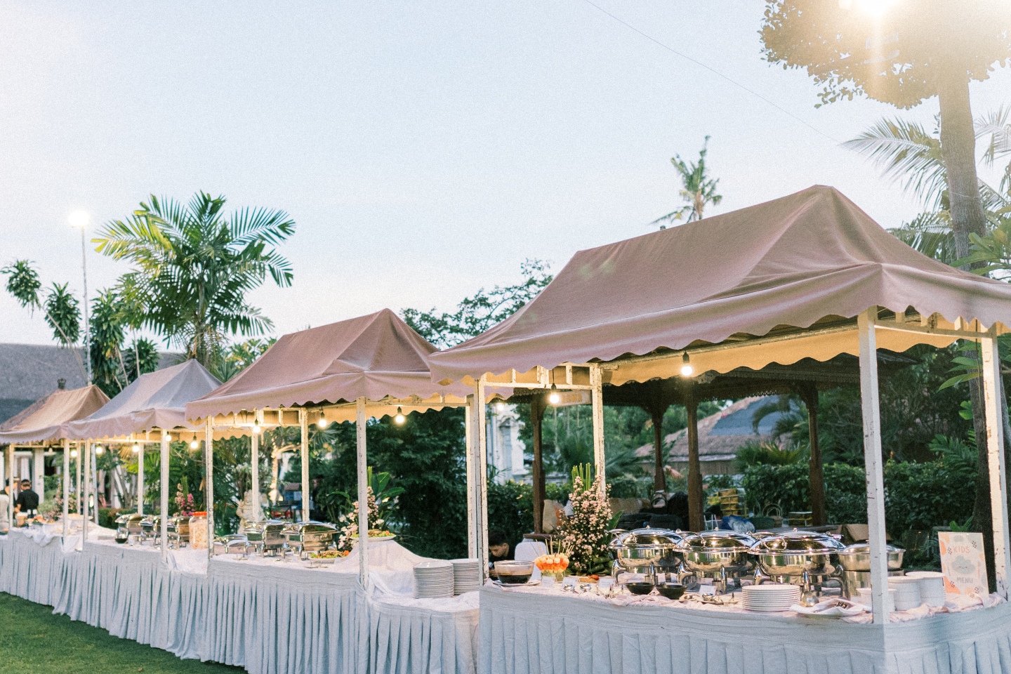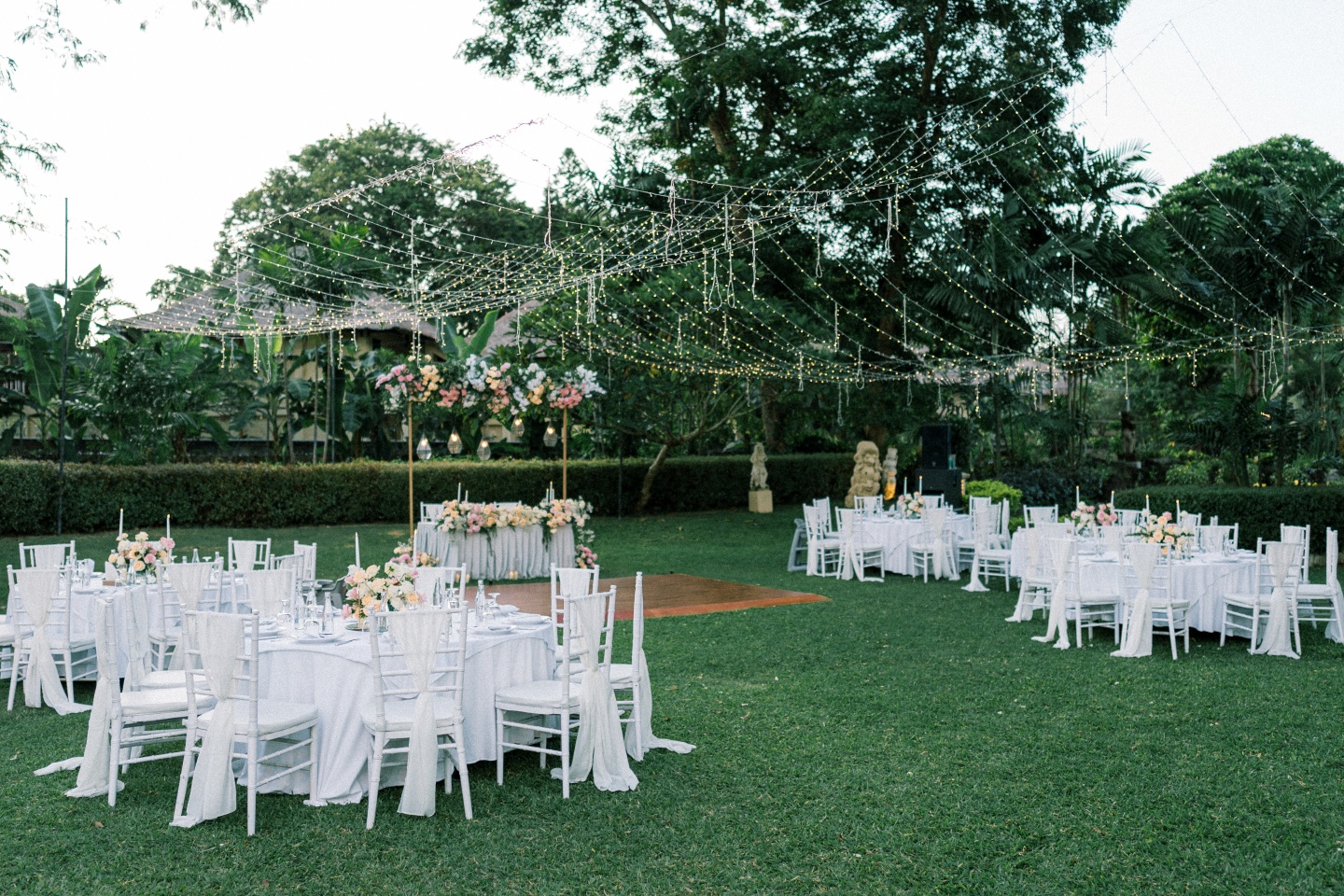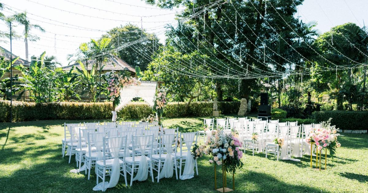 Floral decorations breathe aesthetic life into a wedding in Prama Sanur. White, pink, and natural greenery form a timeless trio, representing elegance, tenderness, and naturalness in visual harmony.