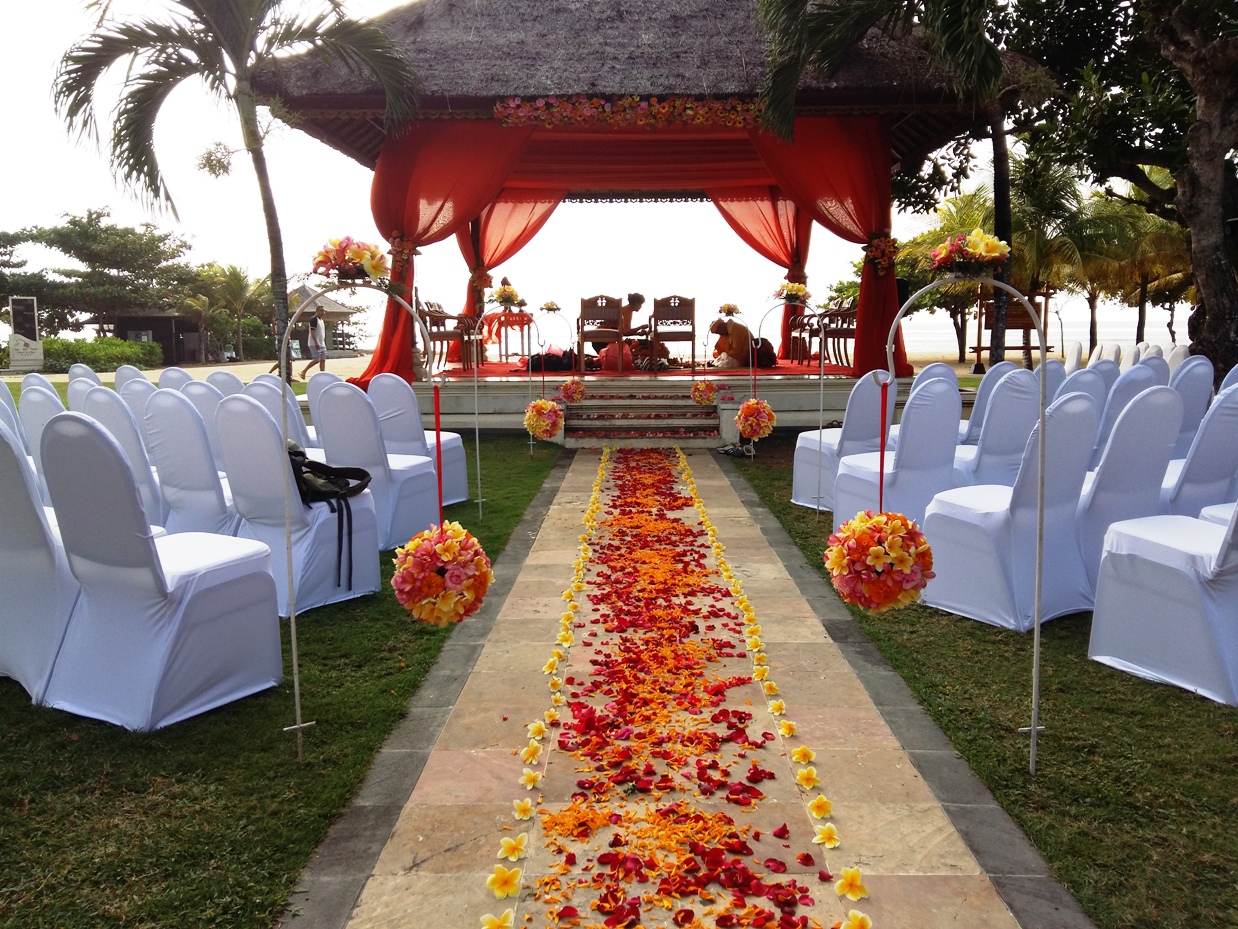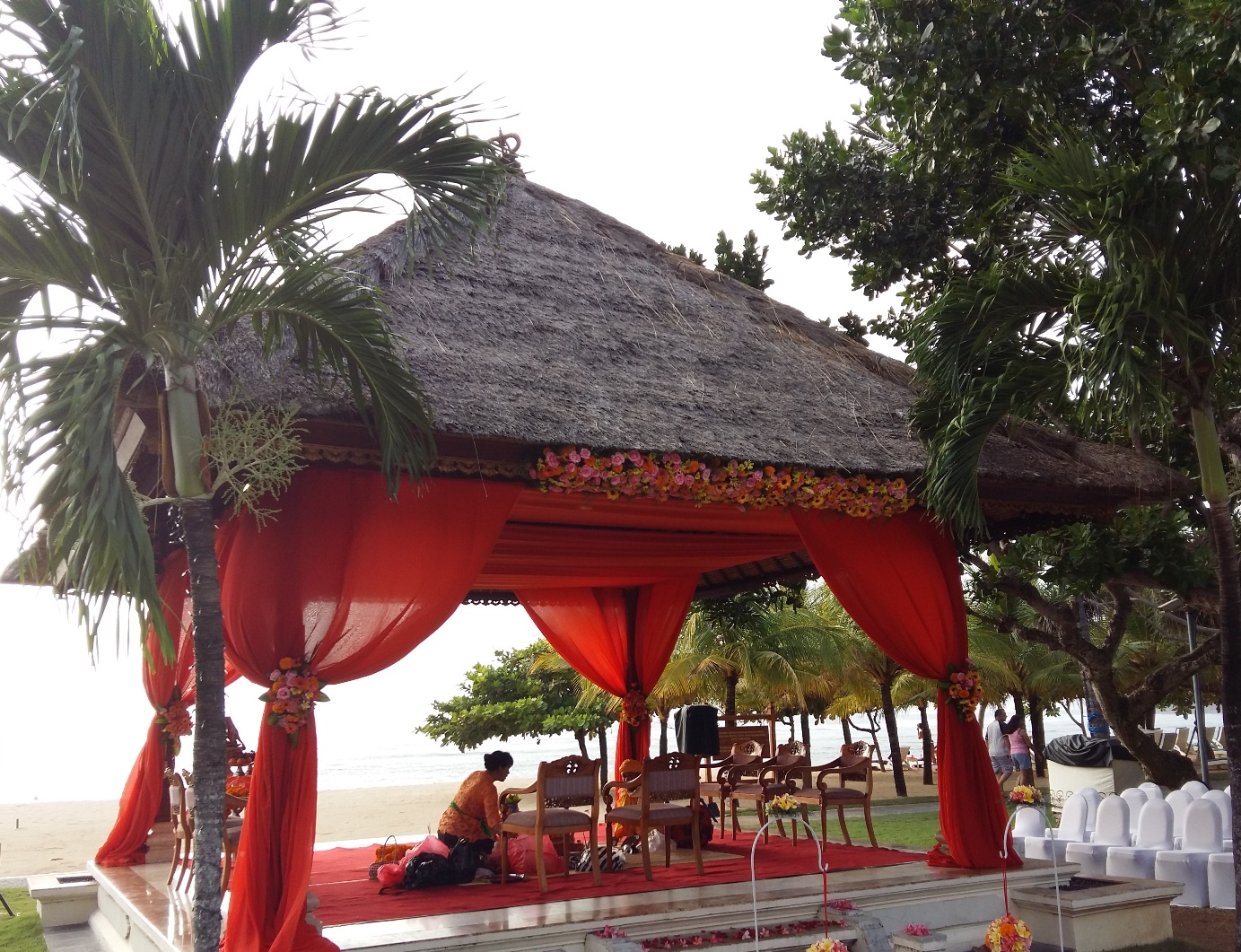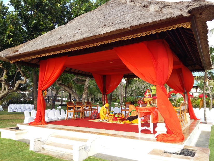 Nusa Dua Beach is a great place for your Indian wedding, this hotel has an existing wedding Bale which you may use as your wedding mandap and no need to establish another one, but you only need to decorate it. This wedding Bale size is about 6 x 6 meter with 4 wooden poles, and thatch roof. The surrounding is supported by a green ground and white sandy beach back ground. This wedding Bale is suitable for any wedding ceremony such Christian, Budhism, Indian Hindu Wedding or Sikh wedding.