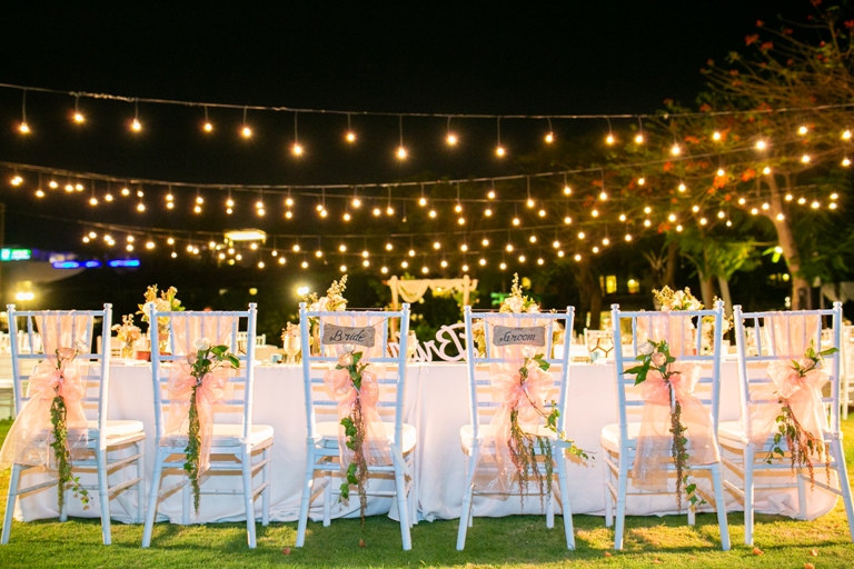 The light bulb also can be set up for a bridal table with different decoration theme. For the rustic theme with light bulb can be set up with a bamboo structure. Light bulbs combined with fairy light or hanging lampion also will make a great setting. The number of light bulbs required is depend on the size of your event.