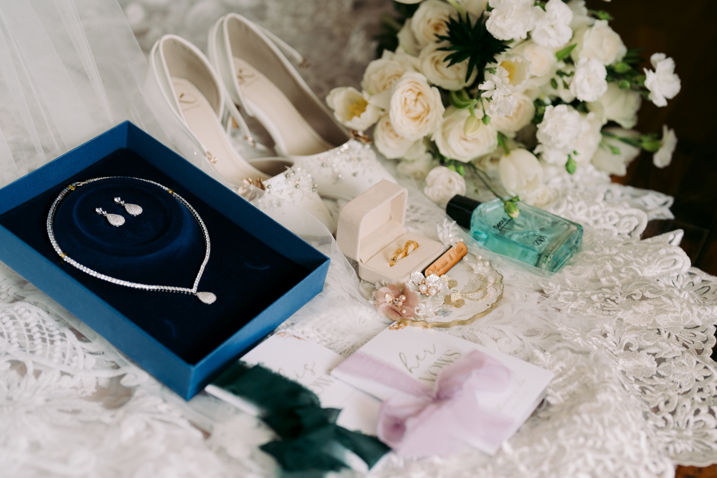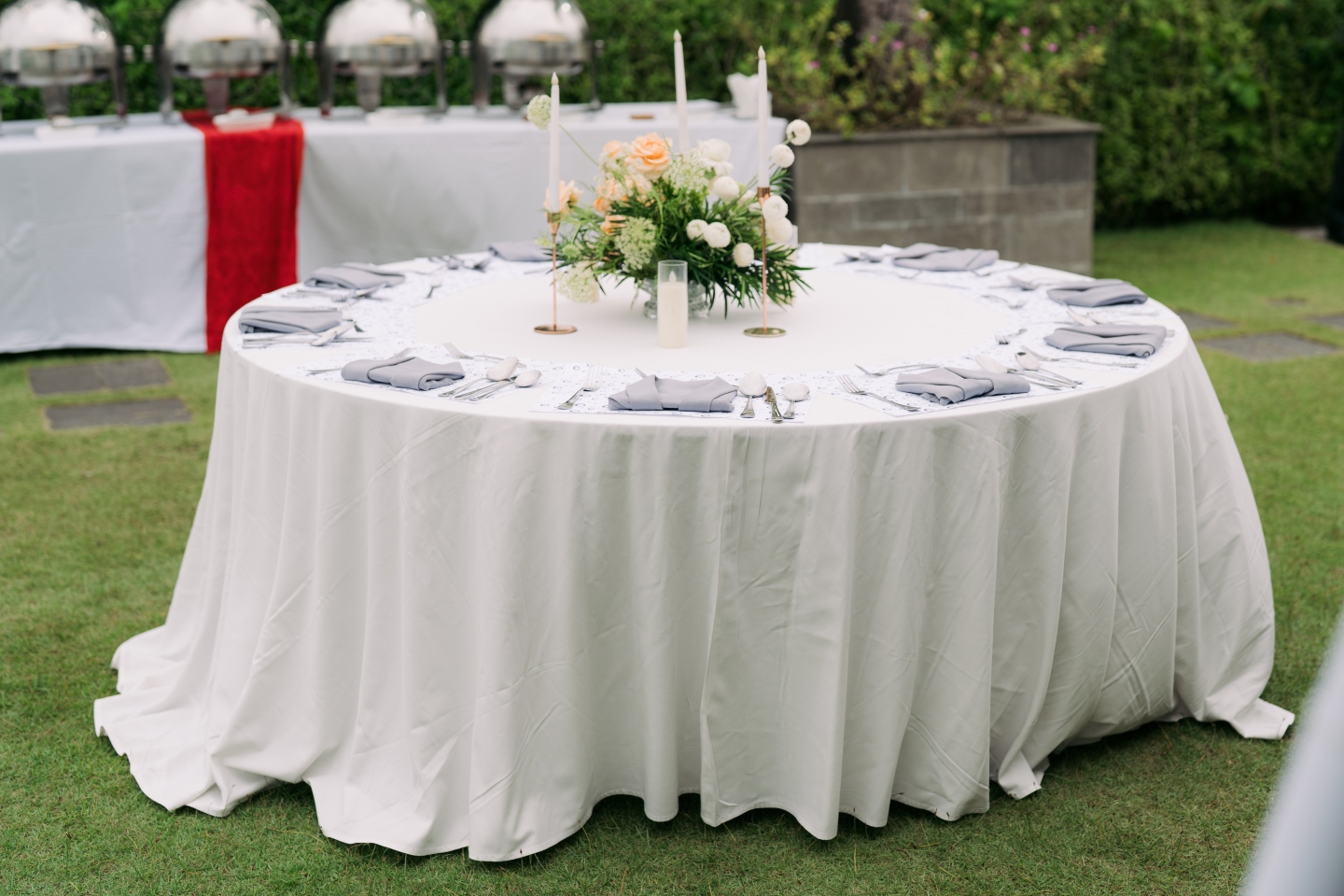 The ceremony space on the rooftop deck was equally curated. Simple white Tiffany chairs lined a wooden pathway, with clusters of baby’s breath in the aisles. The welcome area featured a minimalist gold-framed welcome sign with elegant typography that perfectly balanced the chic, modern Balinese aesthetic. From the unique floral arches that combined roses, tulips, hydrangeas, cotton bolls, and cascading white tassels to the detailed table settings with soft grey napkins and elegant silverware, every element was considered.