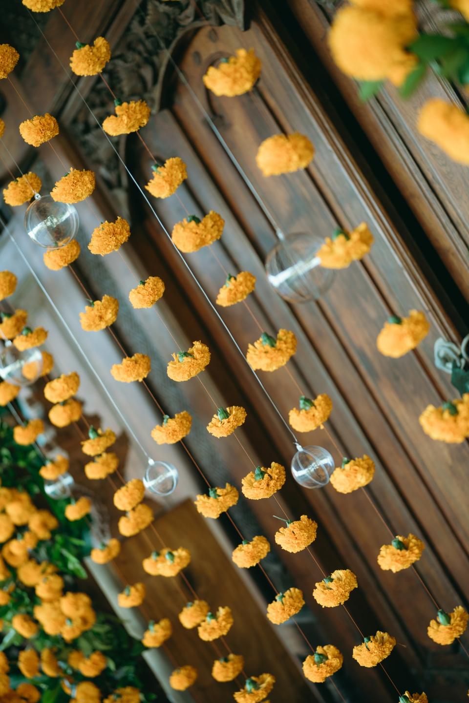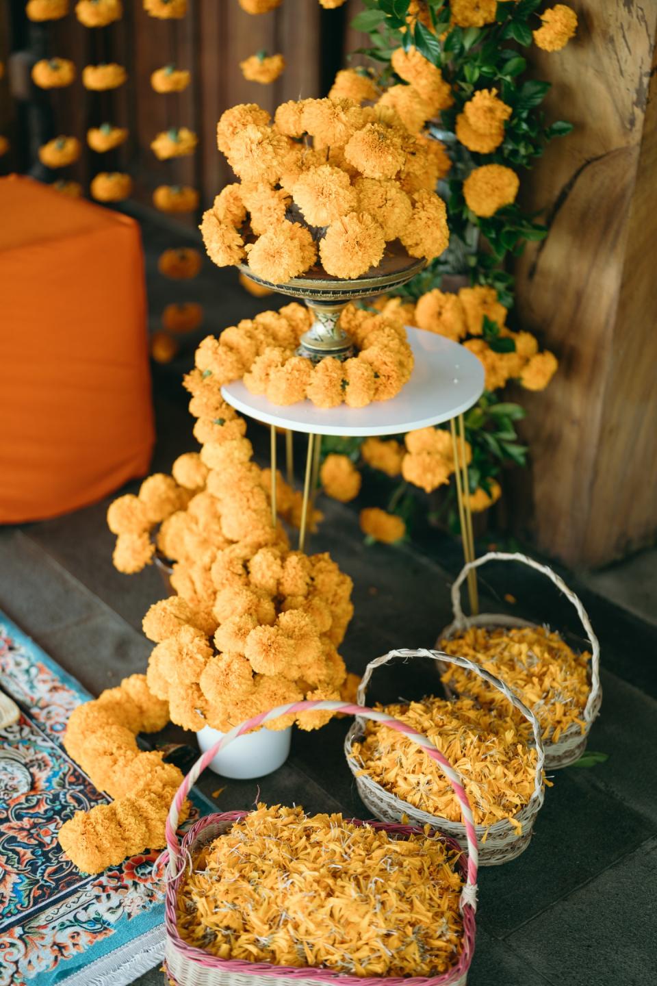 - The Aura: Marigolds, symbolising the sun, prosperity, and new beginnings in Indian culture, were displayed in long garlands, drapes, and magnificent arrangements. The resulting look was warm, festive, and vibrant—perfect for kicking off the celebrations.
