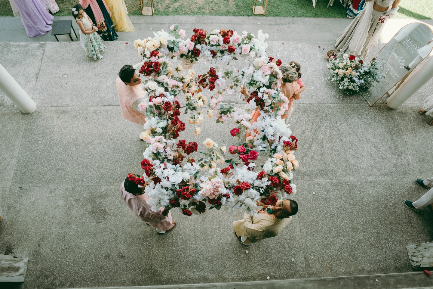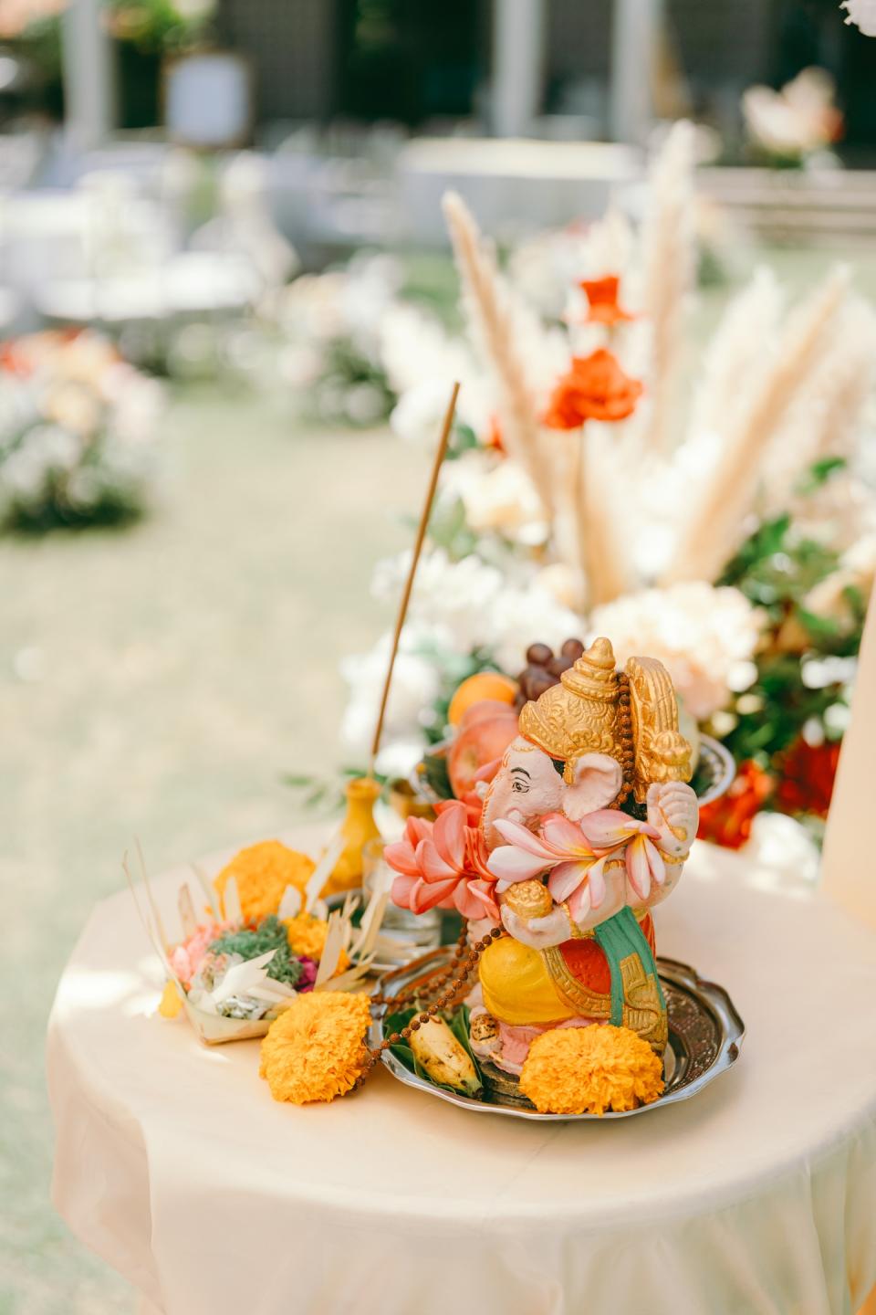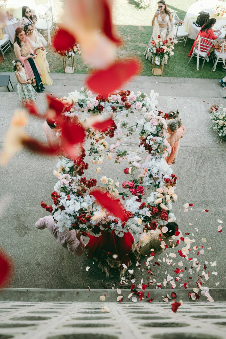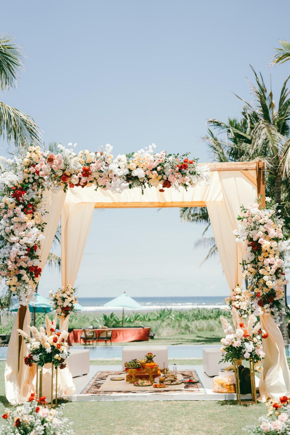 - Mandap Design: The mandap (wedding canopy) was designed grandly with carvings and rich drapes of neutral flowers, emphasised by red floral accents as a symbol of the sacred bond. This combination balanced classic Balinese beauty with the solemnity of Indian tradition.