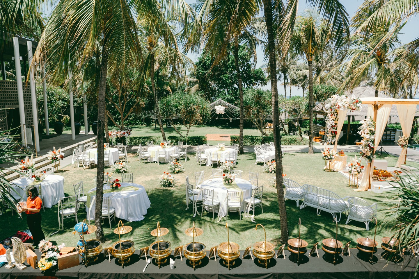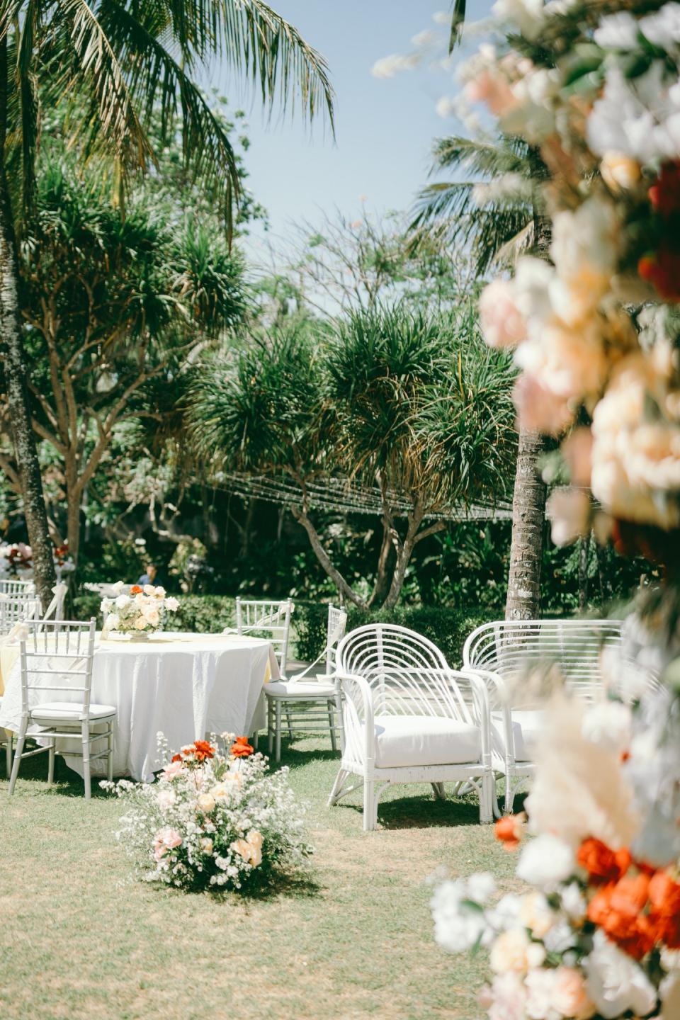 For the main wedding ceremony, the atmosphere transitioned to be more elegant and profound, while still retaining elements of Balinese luxury.