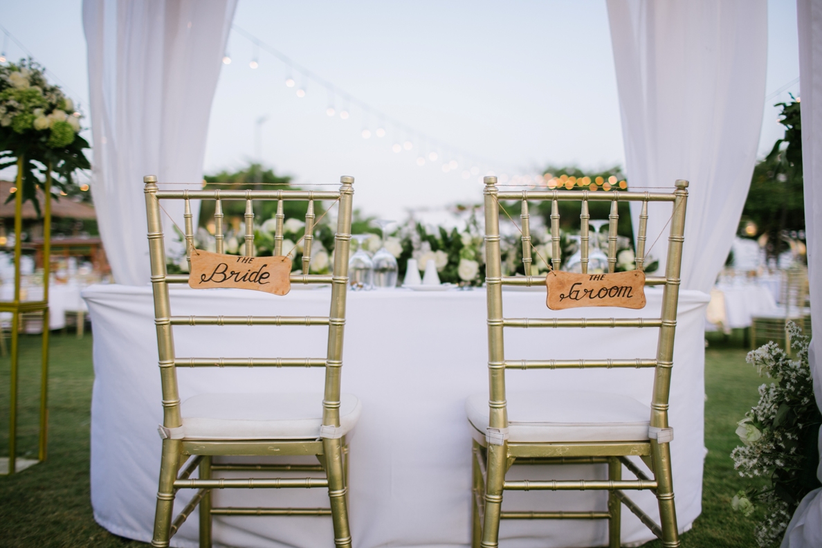 Bridal Table designed for Two or just for bride and groom, the bridal table composed by pergola with white linen, hanging light bulb and hanging chandelier, two tiffany chairs with sash, hanging bride and groom letter on the back chairs, candle light on the table