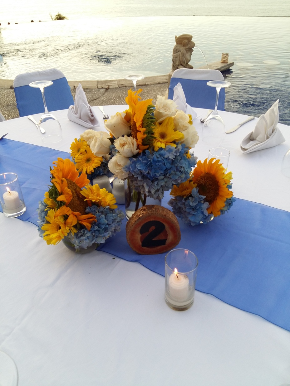 Sunflower centerpiece combine with Blue Hydrange in 3 different size of vases make your dinner table look pretty, this centerpiece was created for wedding couple who love Sunflower. The Sunflower centerpiece include vintage Table Number. Rp 850.000Category: CenterpiecesProduct Rating: 0No votes yet