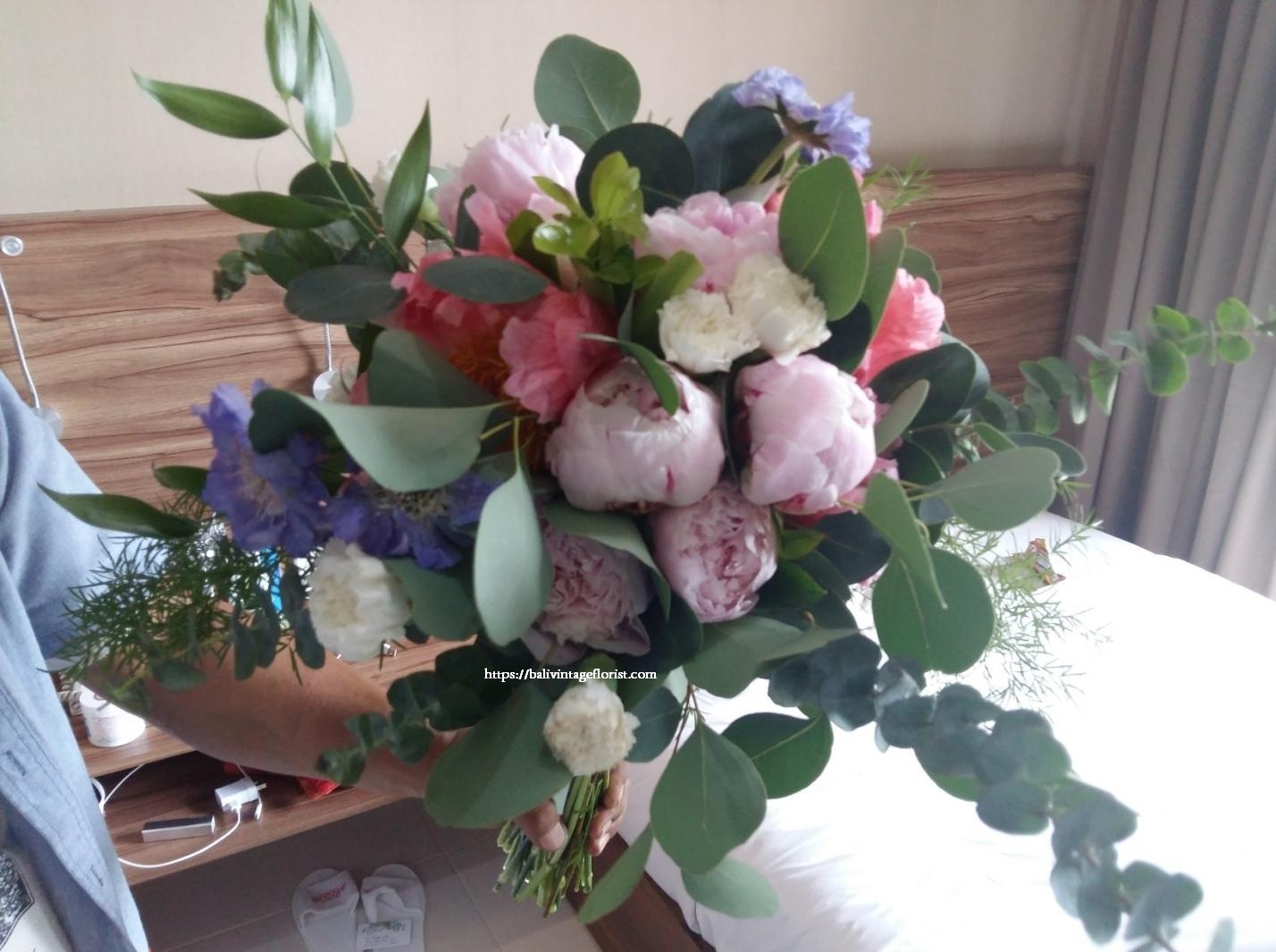 Bridal bouquet composed by Peony, Baby Rose, Eucalyptus, and Scabiosa Rate excludes delivery fee Rp 3.500.000Category: Hand BouquetsProduct Rating: 0No votes yet