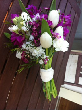 Intoducing our exquisite bridal hand bouquet, crafted with meticulous attention to detail. This stunning arrangement features delicate wax flowers, elegant white tulips, charming dianthus, and enchanting ornithogalum blooms. Each flower is carefully selected to create a harmonious blend of textures and colors, perfect for complementing any bridal ensemble. Elevate your wedding day with this timeless bouquet, designed to add a touch of elegance and romance to your special occasion.