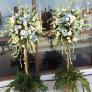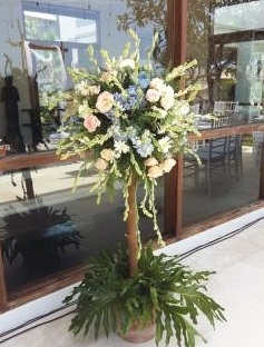 Standing flower with a natural wood stand can be a choice for rustic or vintage theme wedding decoration. This standing flower is composed by tuberose, blue hydrangea, local rose flower, and combined with some green leaves. The bottom part is composed by green leaves with a bucket vase.