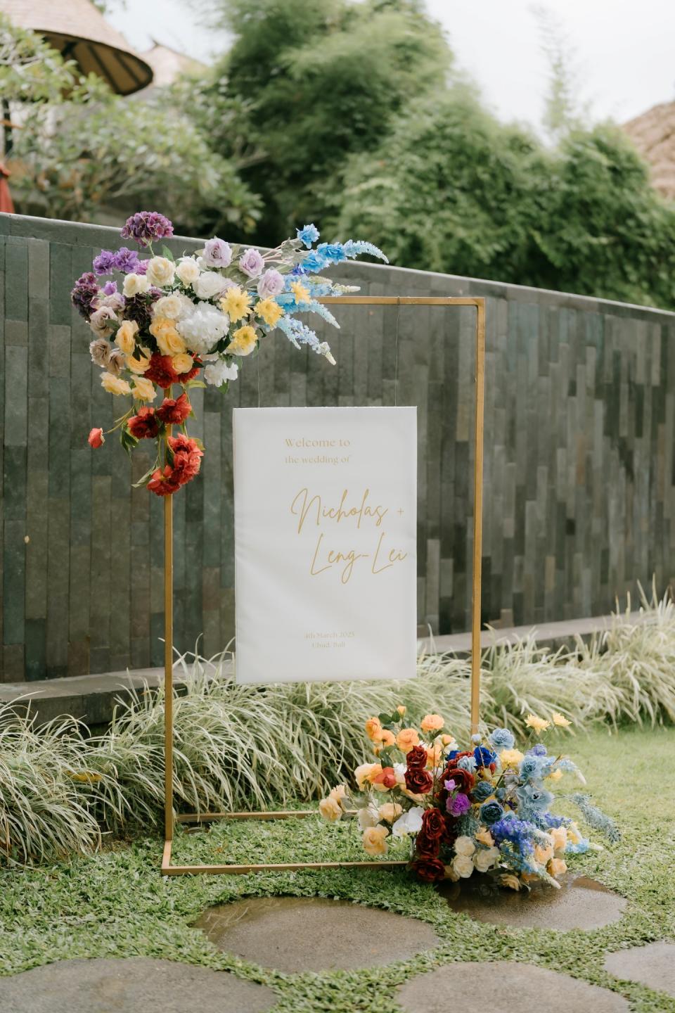 Embrace a natural or bohemian style with free-form, curvy arrangements; hanging bouquets; or tall floral installations on the altar. These colours work particularly well with outdoor, rustic or tropical altars.