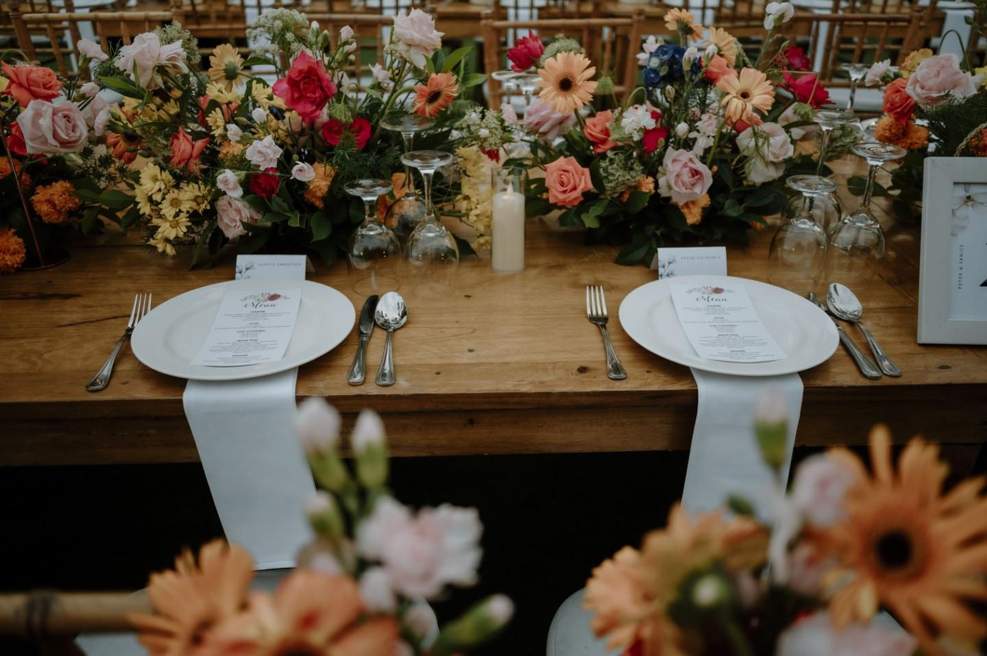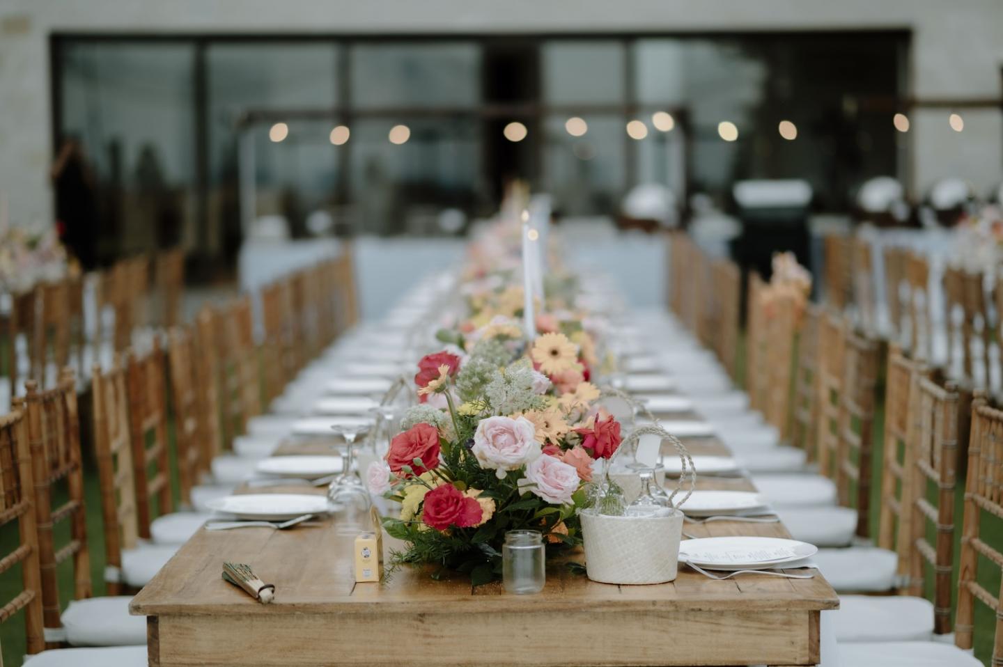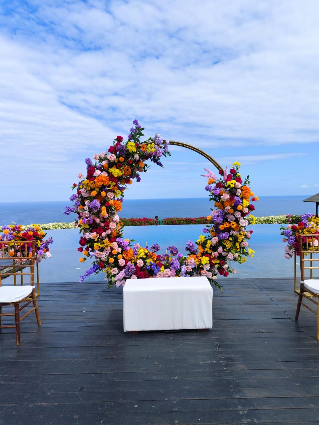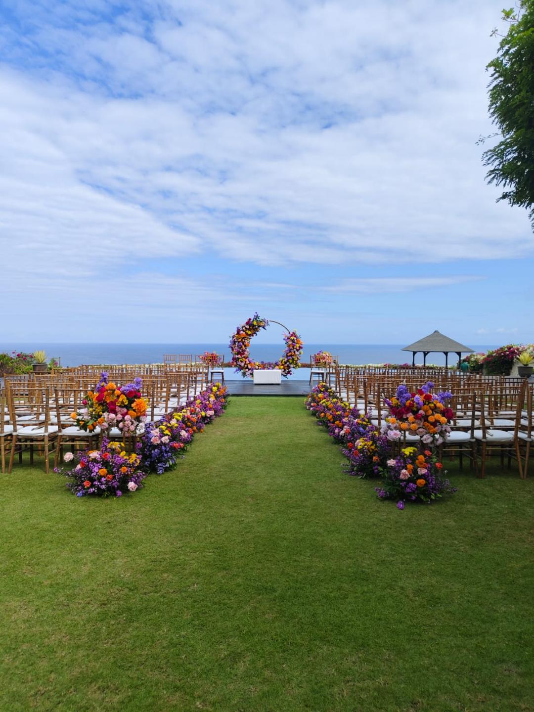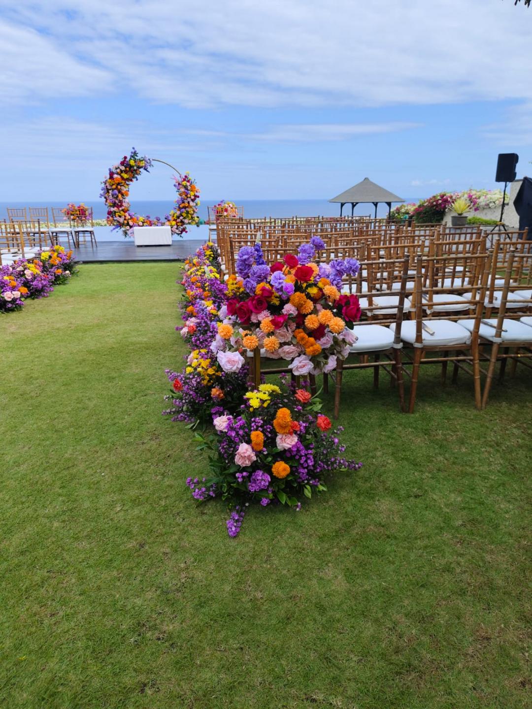 Dengan latar belakang samudra biru yang luas, area pernikahan ini dikelilingi oleh hamparan rumput hijau yang rapi dan kursi-kursi berlapis kayu yang ditata rapi untuk para tamu oleh Bali Vintage Florist. Dekorasi bunga yang penuh warna seperti ungu, merah muda, orange, dan kuning ditata dengan apik, menciptakan suasana yang romantis dan penuh keindahan. Setiap elemen dekorasi pernikahan dari Bali Vintage Florist dipilih dengan cermat untuk menambah kesan kemewahan dan keanggunan pada acara pernikahan.