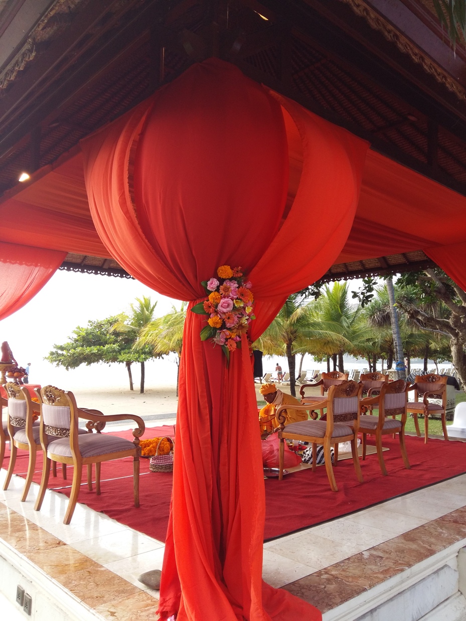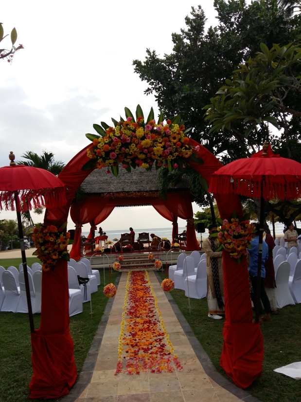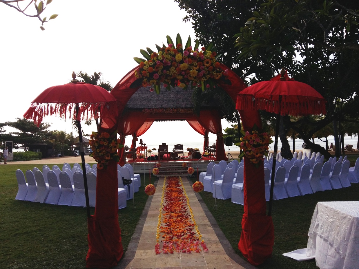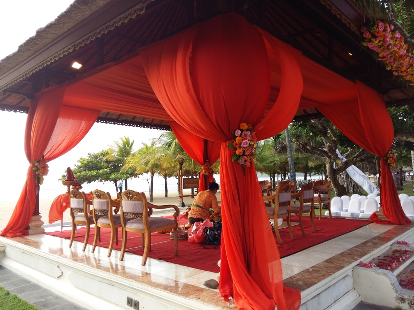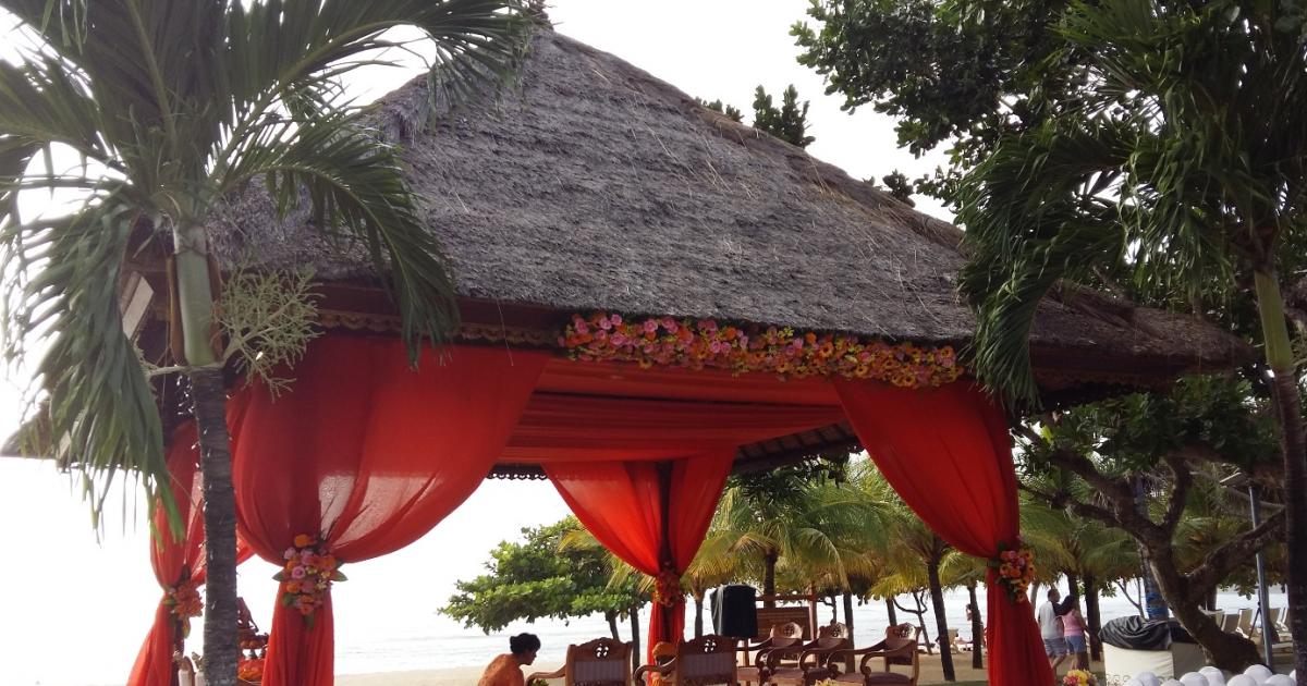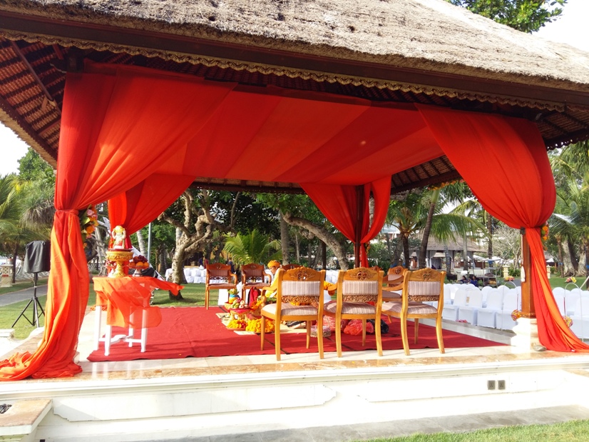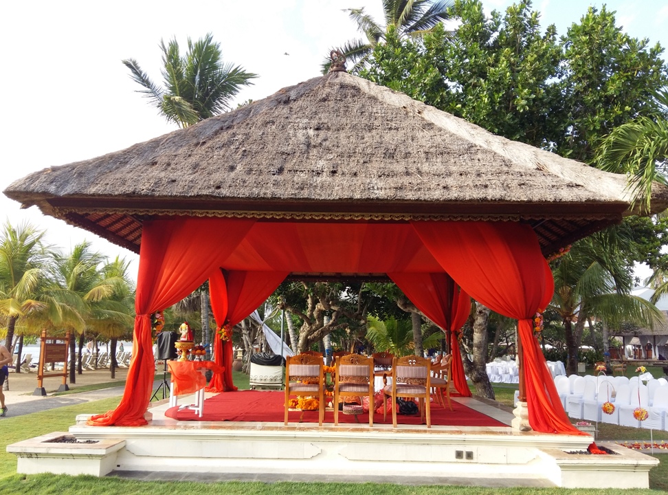 Nusa Dua Beach is a great place for your Indian wedding, this hotel has an existing wedding Bale which you may use as your wedding mandap and no need to establish another one, but you only need to decorate it. This wedding Bale size is about 6 x 6 meter with 4 wooden poles, and thatch roof. The surrounding is supported by a green ground and white sandy beach back ground. This wedding Bale is suitable for any wedding ceremony such Christian, Budhism, Indian Hindu Wedding or Sikh wedding.