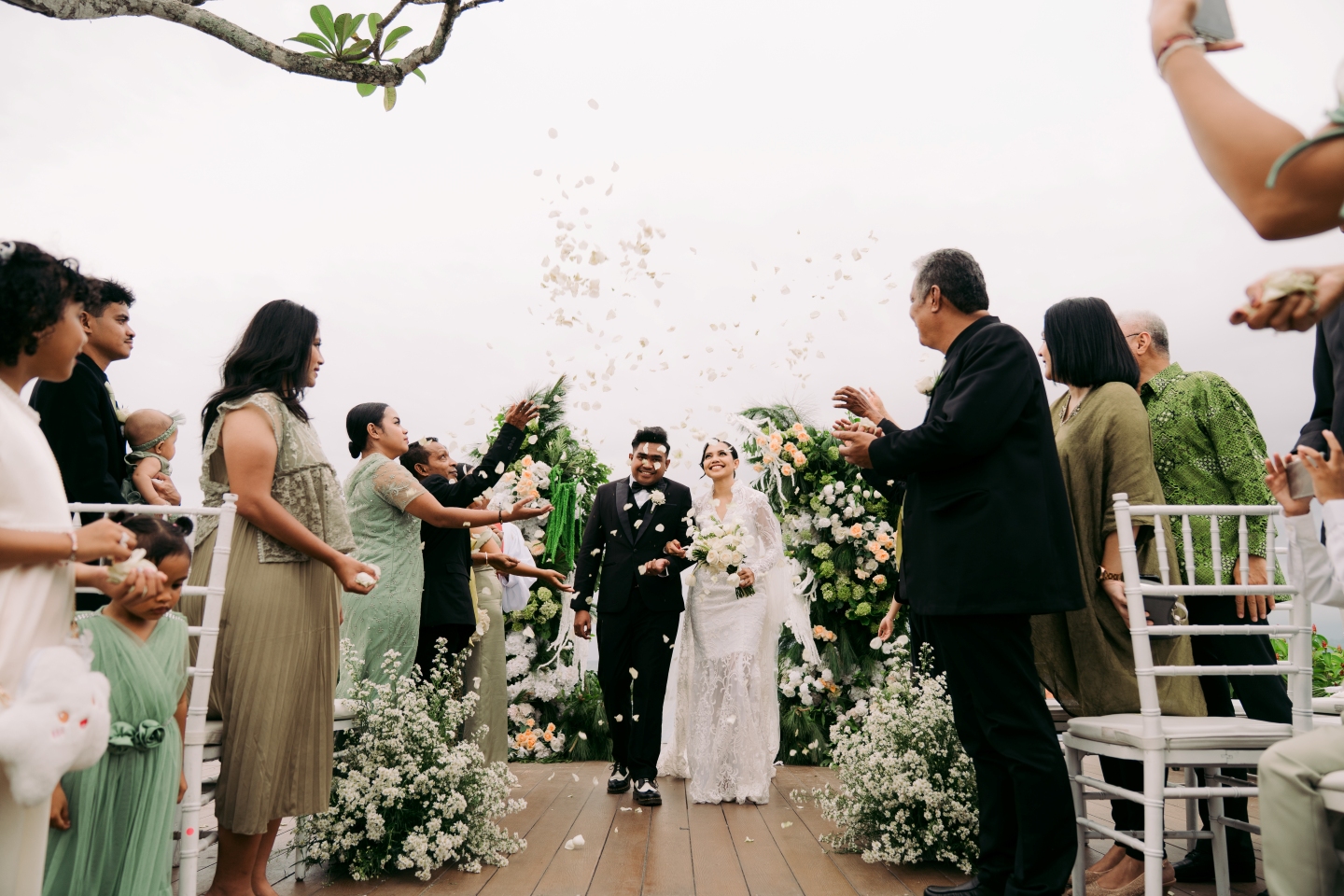 Picture this: the soft Balinese sky meets an endless ocean horizon, and the air is sweet with the scent of fresh roses, tulips, and a touch of salt. That’s the magic we found at Marviecx & Vilia’s stunning modern-chic wedding at FOX Hotel Jimbaran Beach. The entire aesthetic, a seamless blend of natural beauty and curated elegance, was a vision to behold, set against the backdrop of the stunning infinity pool deck.