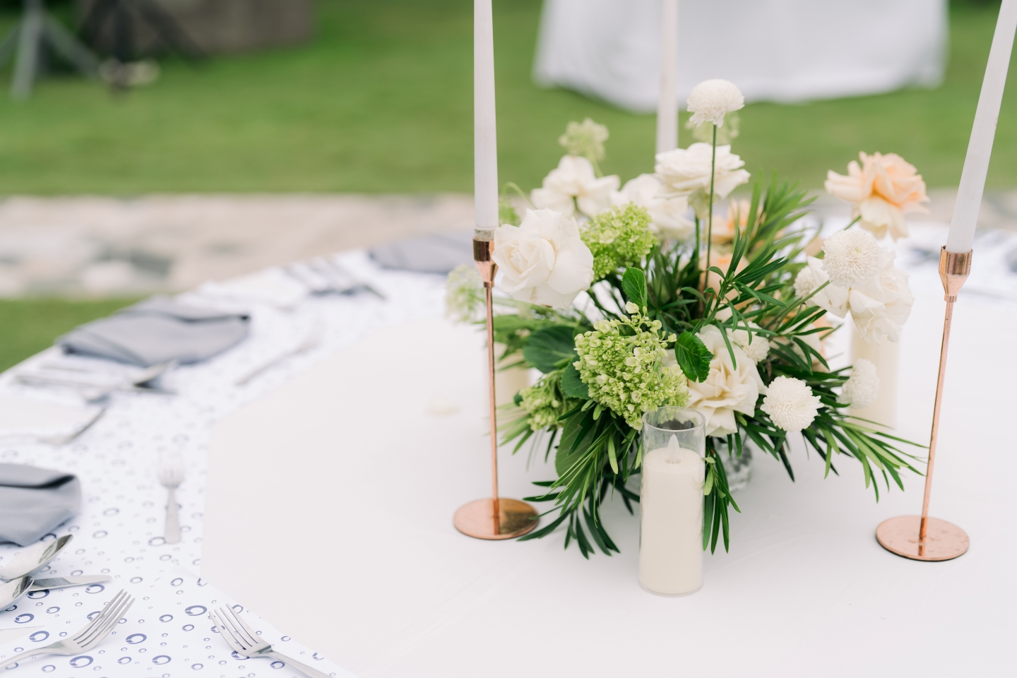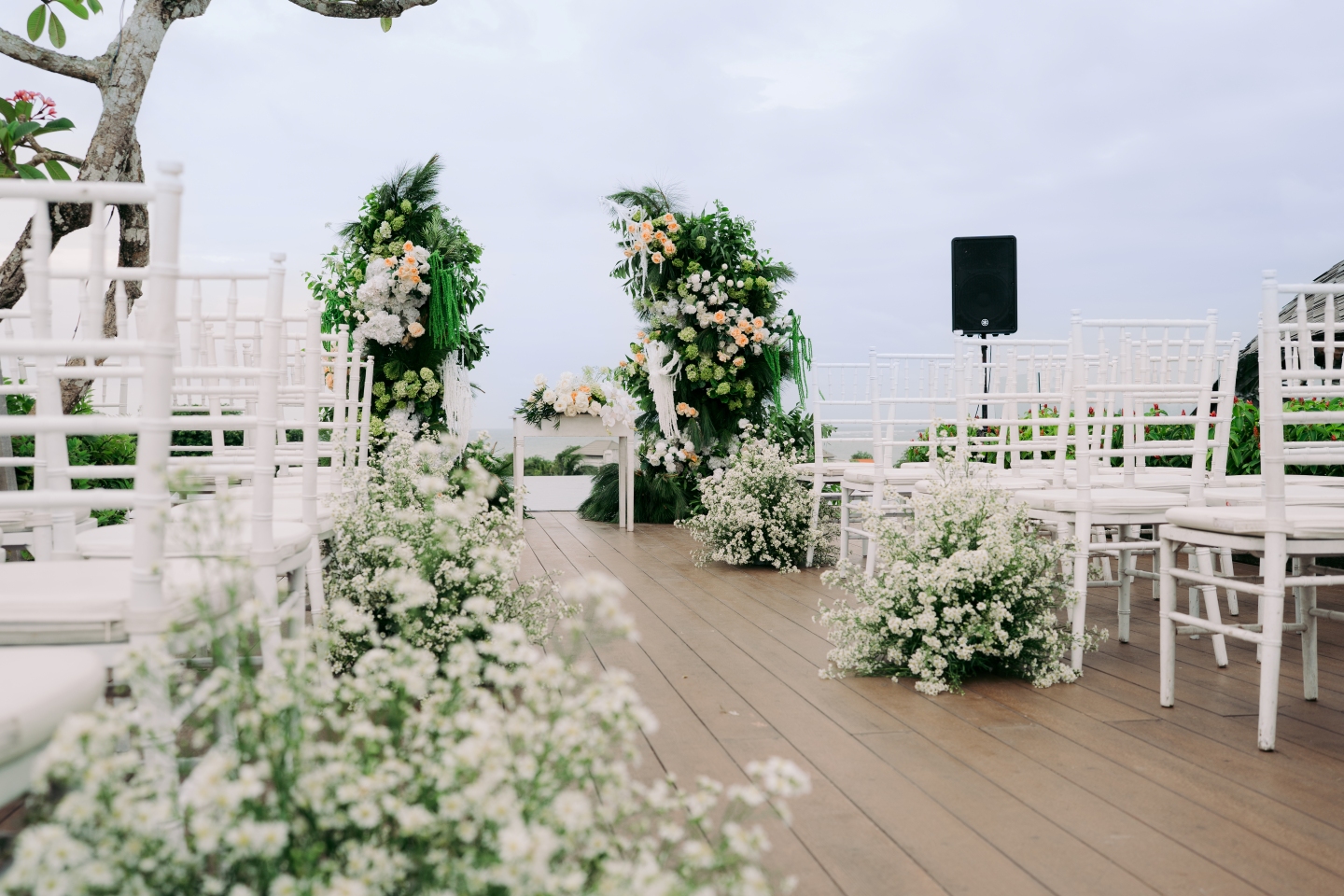 The ceremony space on the rooftop deck was equally curated. Simple white Tiffany chairs lined a wooden pathway, with clusters of baby’s breath in the aisles. The welcome area featured a minimalist gold-framed welcome sign with elegant typography that perfectly balanced the chic, modern Balinese aesthetic. From the unique floral arches that combined roses, tulips, hydrangeas, cotton bolls, and cascading white tassels to the detailed table settings with soft grey napkins and elegant silverware, every element was considered.
