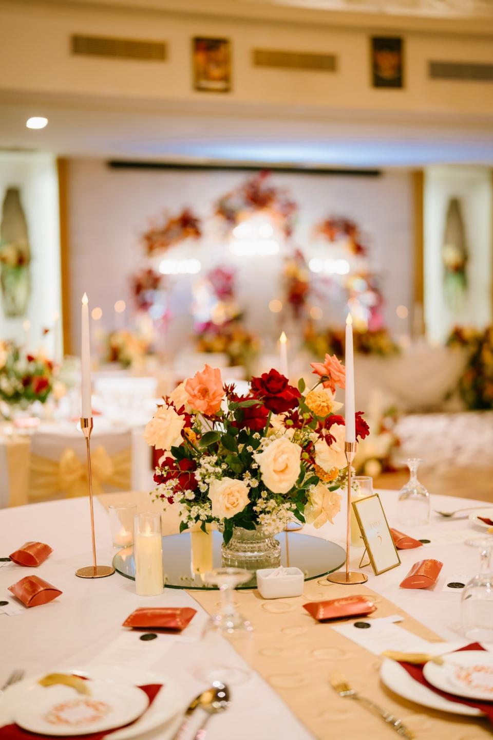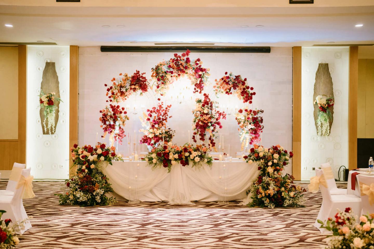 For the reception decor at the Holiday Inn Baruna, the ballroom was transformed into an elegant space featuring a vibrant red and orange theme, creating a warm and festive ambiance perfect for an Indian wedding in Bali. The decor was enhanced with luxurious floral arrangements in shades of orange and red roses, beautifully matching the color scheme. Intricate centerpieces added a touch of grandeur to the venue. Bali Vintage Florist masterfully executed this stunning design, ensuring the traditional Indian elements blended seamlessly with the modern elegance of the ballroom, making it an unforgettable evening for the couple and their guests.