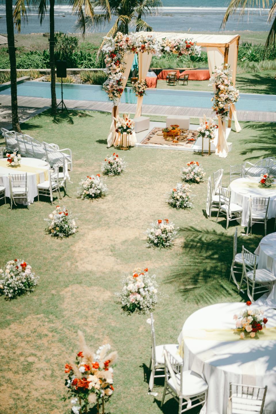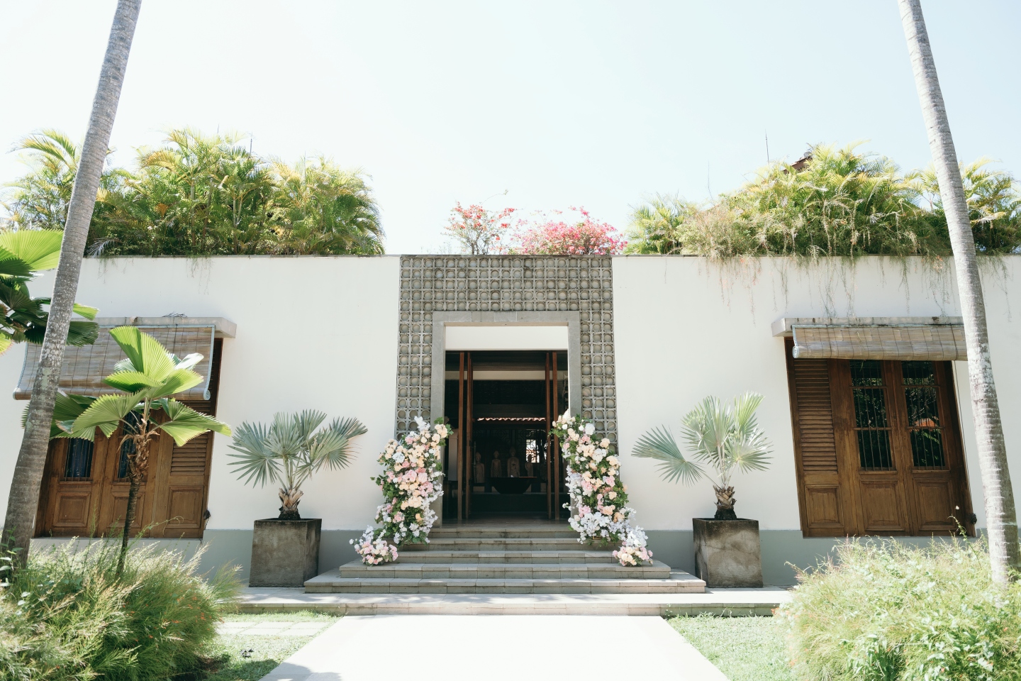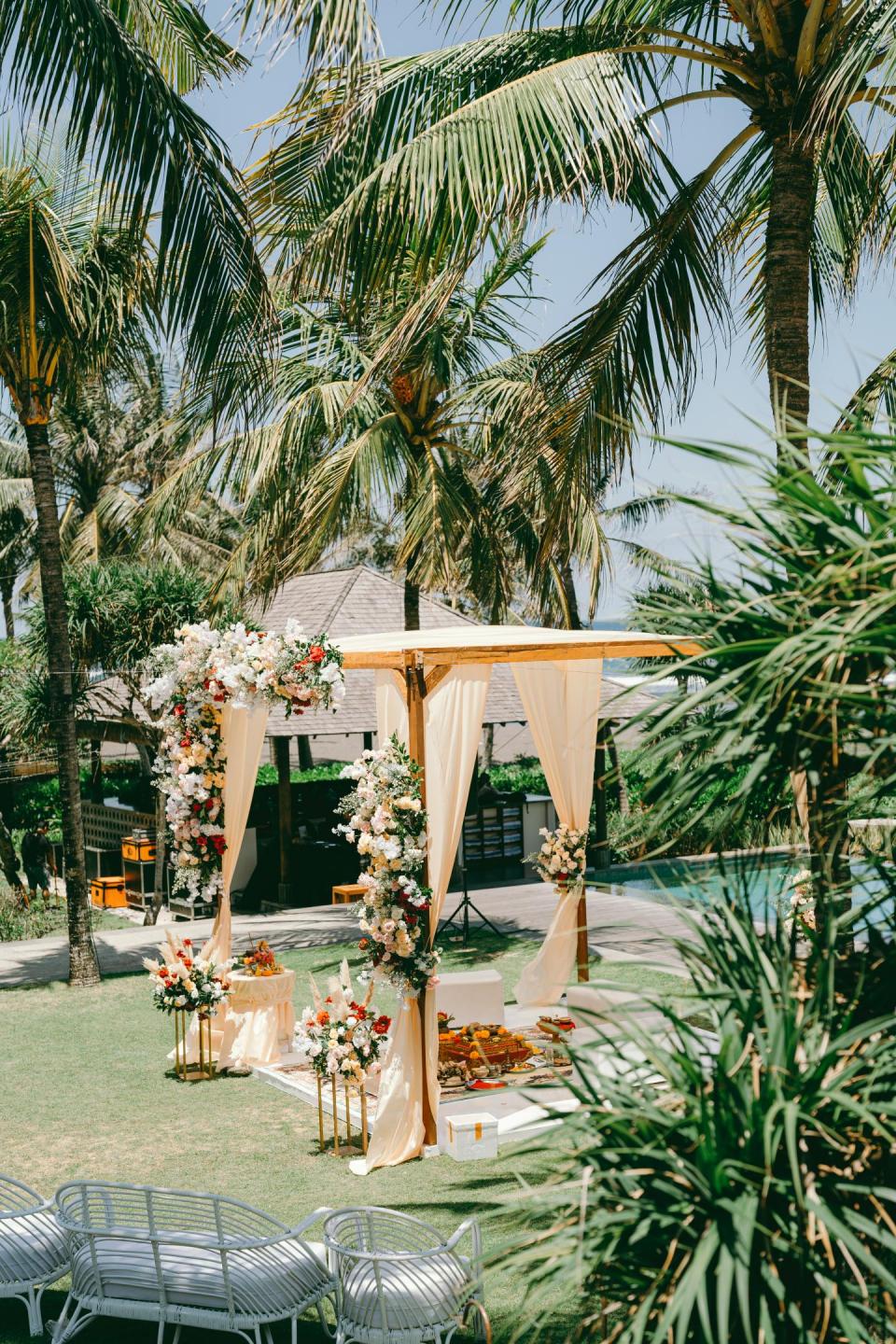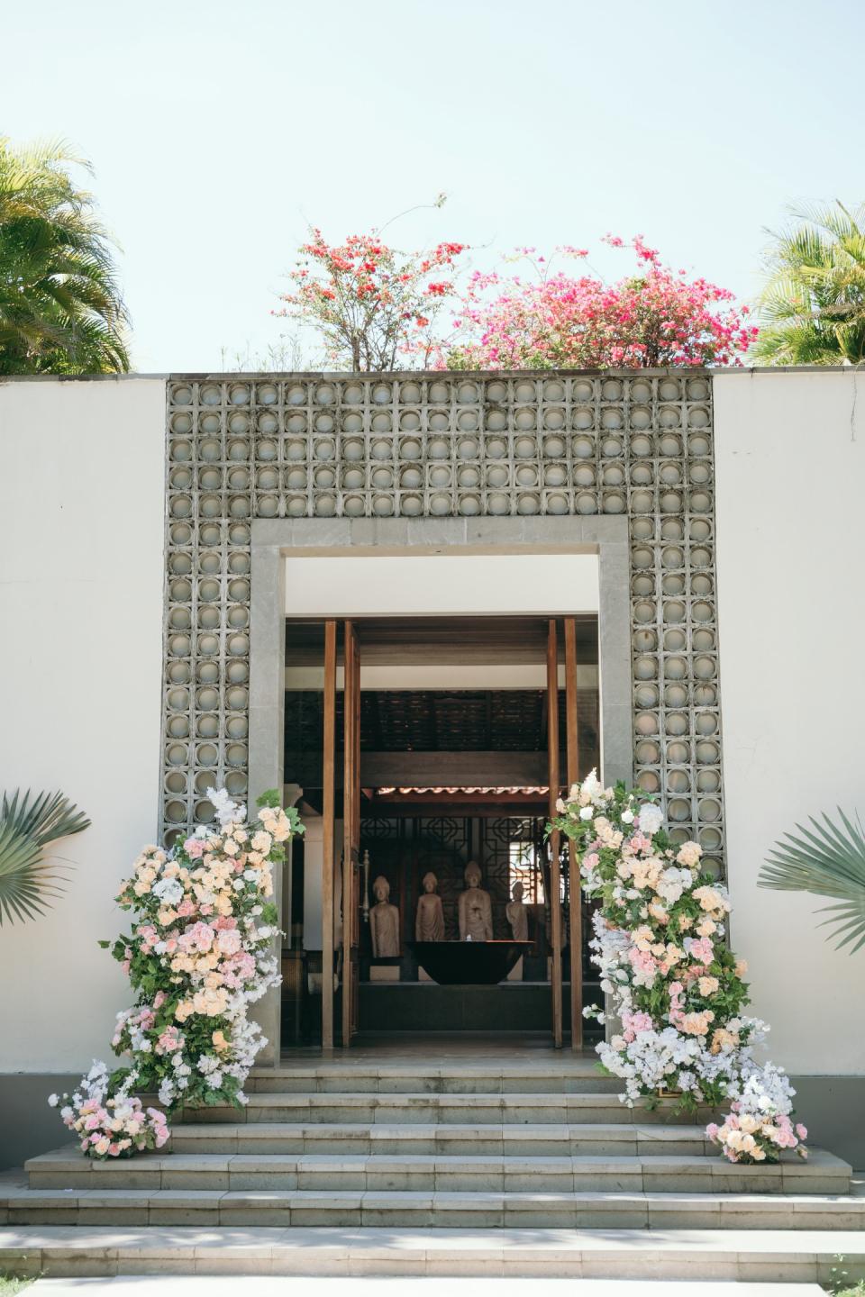 For the main wedding ceremony, the atmosphere transitioned to be more elegant and profound, while still retaining elements of Balinese luxury.