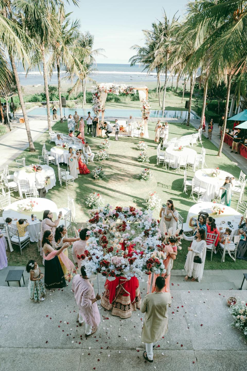 - Mandap Design: The mandap (wedding canopy) was designed grandly with carvings and rich drapes of neutral flowers, emphasised by red floral accents as a symbol of the sacred bond. This combination balanced classic Balinese beauty with the solemnity of Indian tradition.