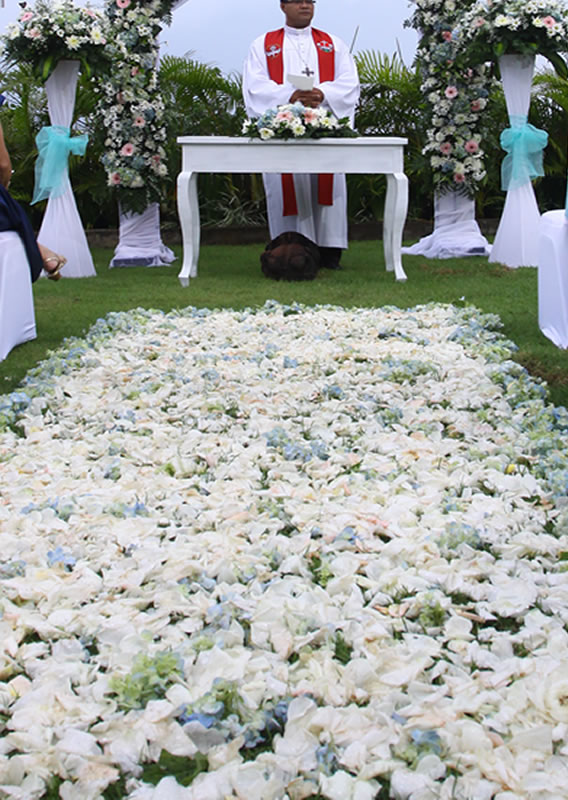 Flower aisle walk way is always set up for every wedding ceremony, either for indoor or outdoor ceremony. We offer a fresh flower asile for outdoor wedding ceremony. The flower aisle is composed by rose flower petals and combine with some other type of flower. The wide of the flower aisle is one meter wide and 5 meter long.