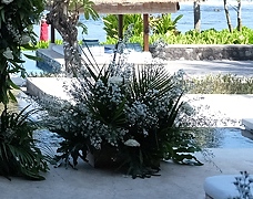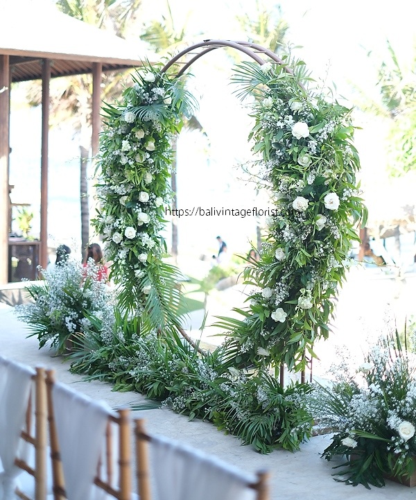 Round Arch Flower with diameter of 120 cm and high 280 cm, composed by Green foliages, White Rose, Peacock, Dendrobium. Price quoted per set consists of one Round Arch and 5 Flower arrangements placed on the ground, exclude delivery and set up fee.
