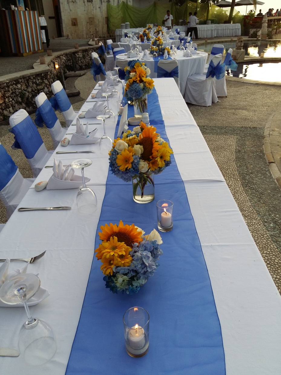 Sunflower centerpiece combine with Blue Hydrange in 3 different size of vases make your dinner table look pretty, this centerpiece was created for wedding couple who love Sunflower. The Sunflower centerpiece include vintage Table Number. Rp 850.000Category: CenterpiecesProduct Rating: 0No votes yet