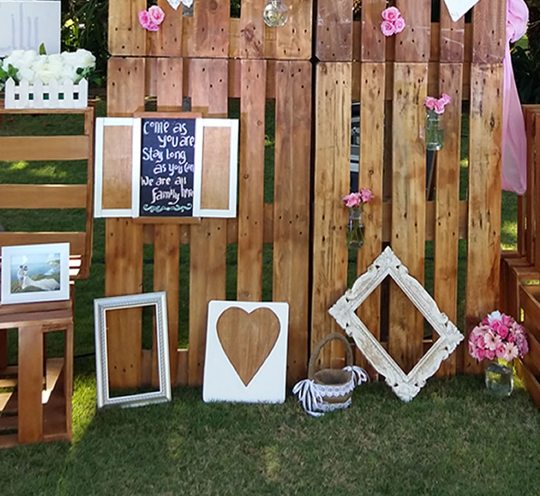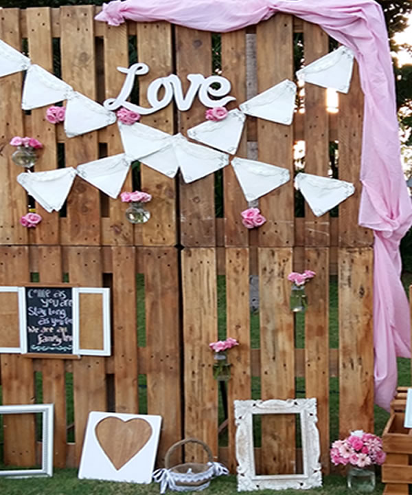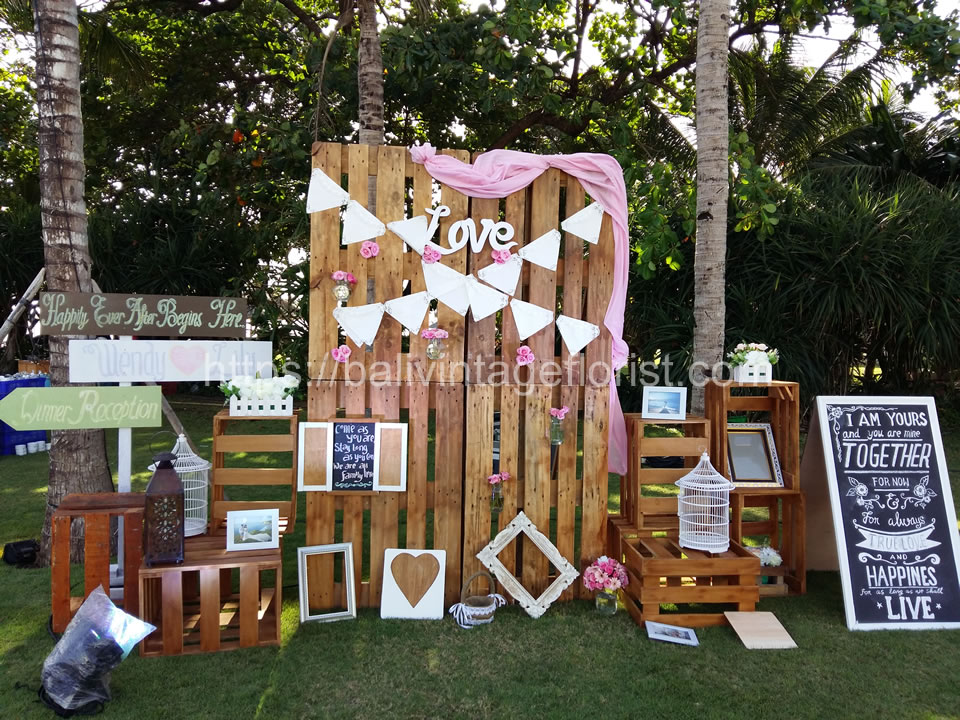 Photo booth decoration for your photo corner will make your wedding party area look beautiful. It is a great corner for your guests, or friends to take photo. It is composed by some rustic material and flower arrangement. Height is around 280 cm, width is 2 meter, include all accessories and flower arrangements.