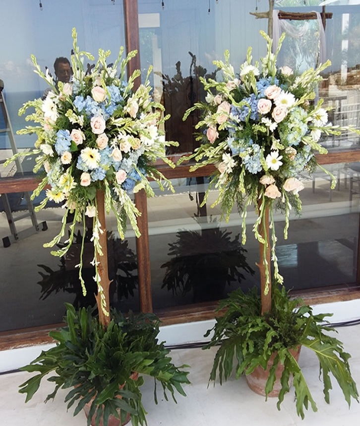 Standing flower with a natural wood stand can be a choice for rustic or vintage theme wedding decoration. This standing flower is composed by tuberose, blue hydrangea, local rose flower, and combined with some green leaves. The bottom part is composed by green leaves with a bucket vase.