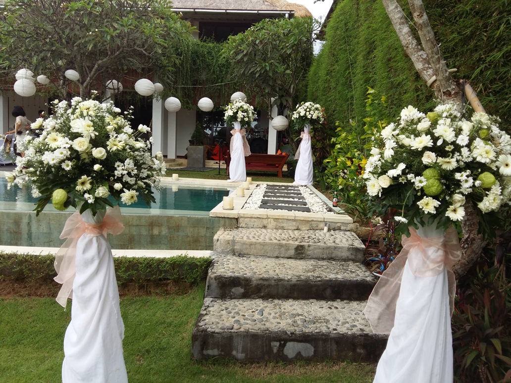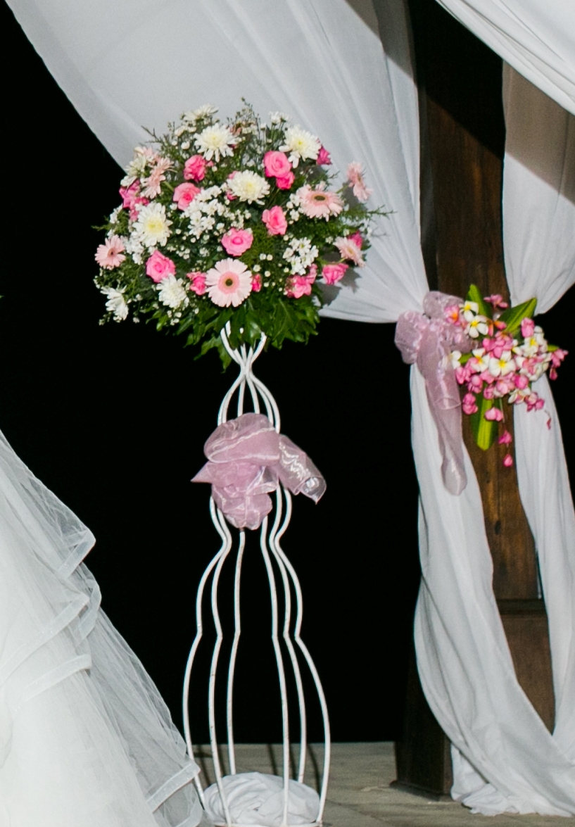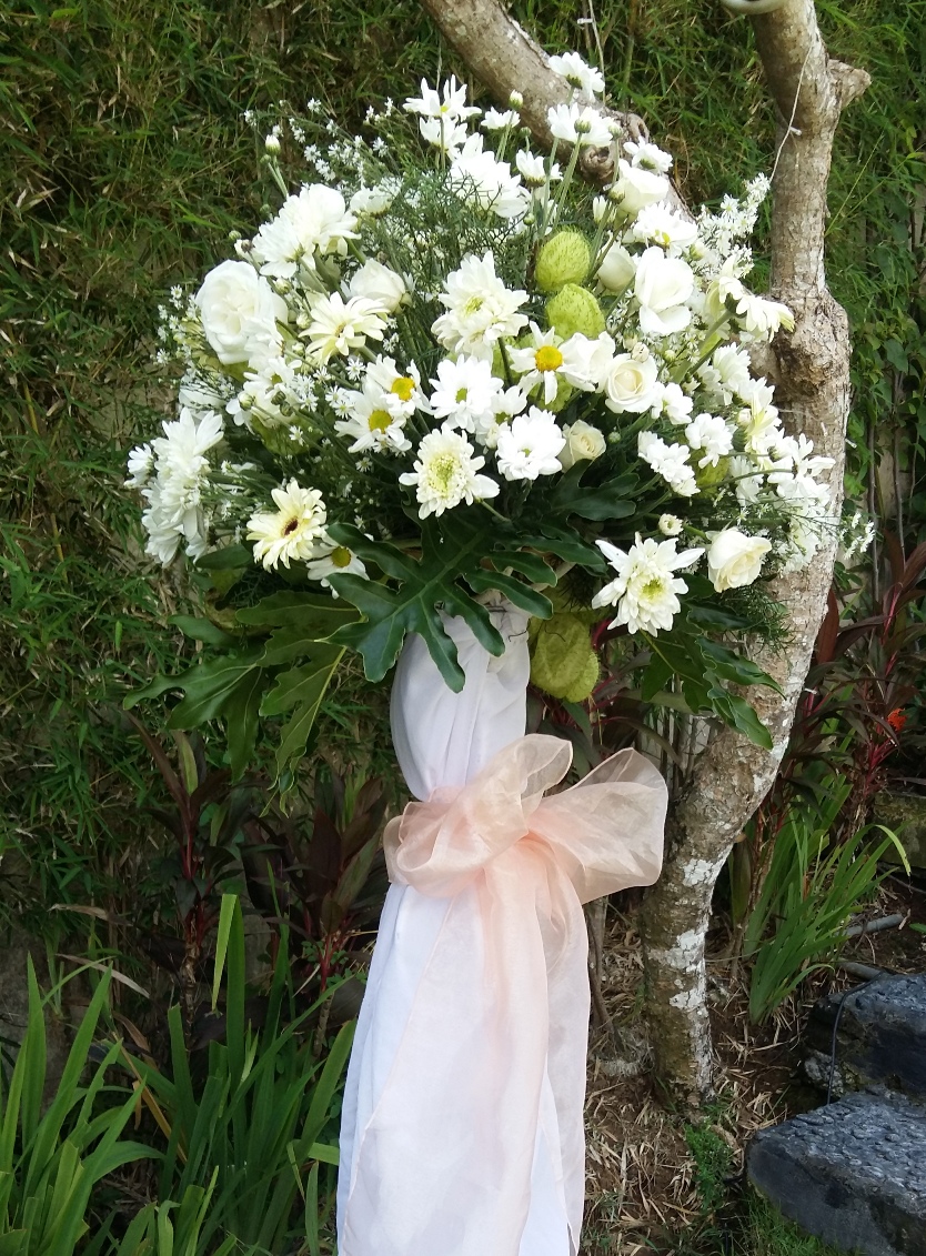 Standing flower with white iron stand can be multipurpose decoration, it can be as an entrance to venue, flower along the isle and event or for hampers as well. The arrangement is composed by local flower. We also provide a custom decoration for the same style using different flower at customize cost.